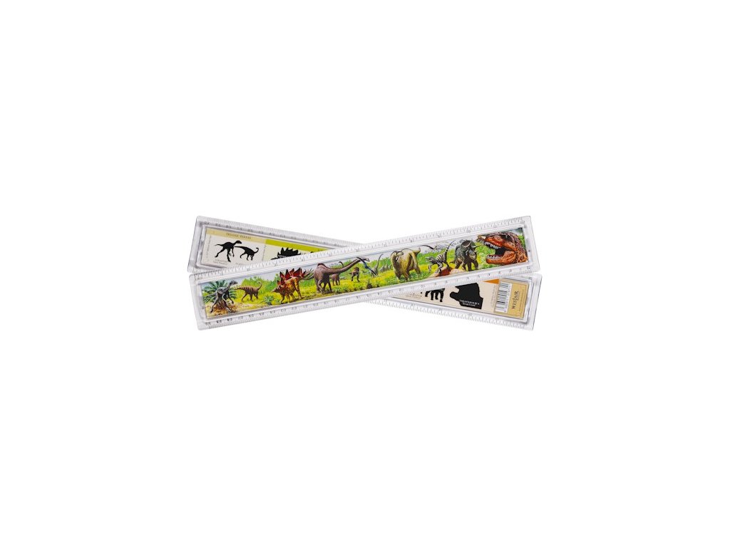 Na prednej strane pravítka je obrázok siluety najznámejších dinosaurov z obdobia Triasu, čo bolo približne pred 227 miliónmi rokov, cez dinosaury z obdobia Jury až po obdobie Kriedy.
