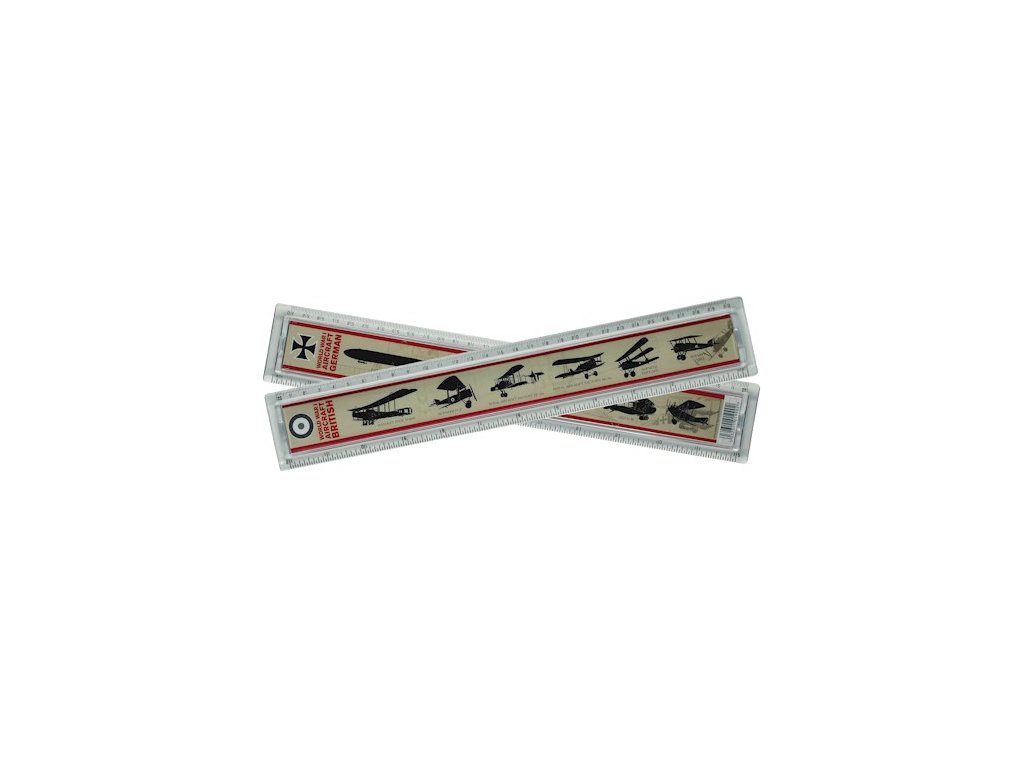 Plastové pravítko - Identifikácia lietadiel z I. Svetovej vojny má mierku v centimetroch aj v palcoch. Na prednej strane sú siluety britských lietadiel a siluety nemeckých lietadiel sú na zadnej strane.