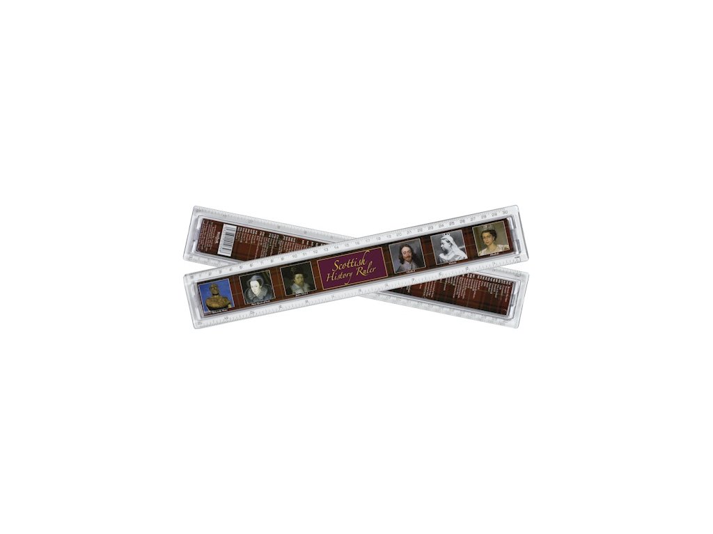 Plastové pravítko - Králi a Kráľovné Škótska má mierku v centimetroch aj v palcoch. Na prednej strane sú obrázky šiestich kráľov a kráľovien a na zadnej strane je časová os škótskych kráľov a kráľovien a najvýznamnejšie udalosti.