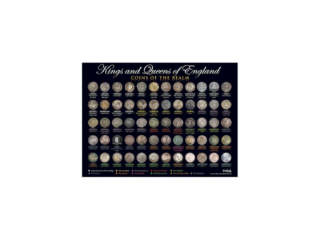 A3 plagát s obrázkom mincí s razbou anglických kráľov a kráľovien - od kráľa Alfréda až po kráľovnú Alžbetu II.