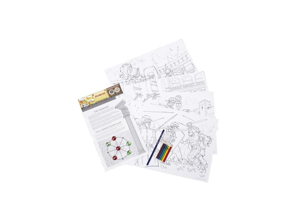 Balíček aktivít a hier - Rímska ríša obsahuje 4 kusy A3 vyfarbovacích listov a 6 farebných ceruziek, rímsku ceruzku s potlačou, reprodukciu rímskej mince, rímsku hru s 6 farebnými korálikmi a vzdelávací informačný list.