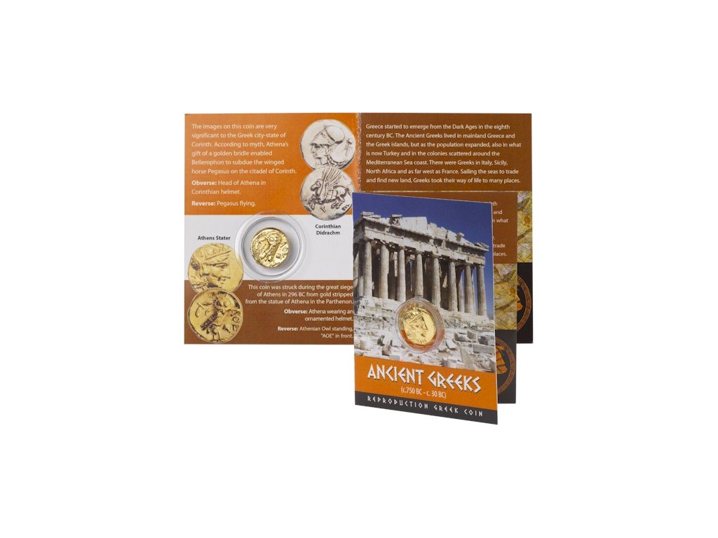 Brožúrka s reprodukciou starogréckej mince Athens Stater, ktorá je zabalená v priehľadnej kapsuľke na prednej strane. Na zadnej strane sú historické informácie o Starovekých Grékoch.