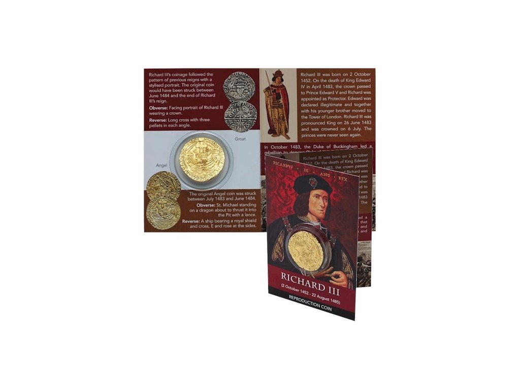 Brožúrka s reprodukciou mince - angel kráľa Richarda III., ktorá je zabalená v priehľadnej kapsuľke na prednej strane. Na zadnej strane sú informácie o živote kráľa Richarda III.