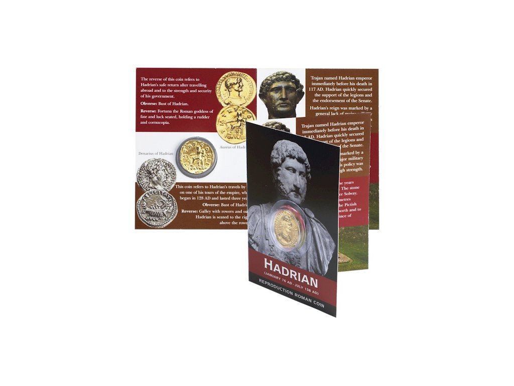 Brožúrka s reprodukciou mince Aureus, ktorá je zabalená v priehľadnej kapsuľke na prednej strane. Na vnútornej a zadnej strane sú informácie o živote rímskeho cisára Hadriána.