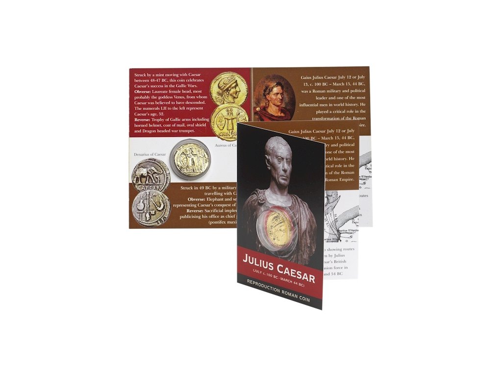 Brožúrka s reprodukciou mince Aureus, ktorá je zabalená v priehľadnej kapsuľke na prednej strane. Na vnútornej a zadnej strane sú informácie o živote Júliusa Caesara.