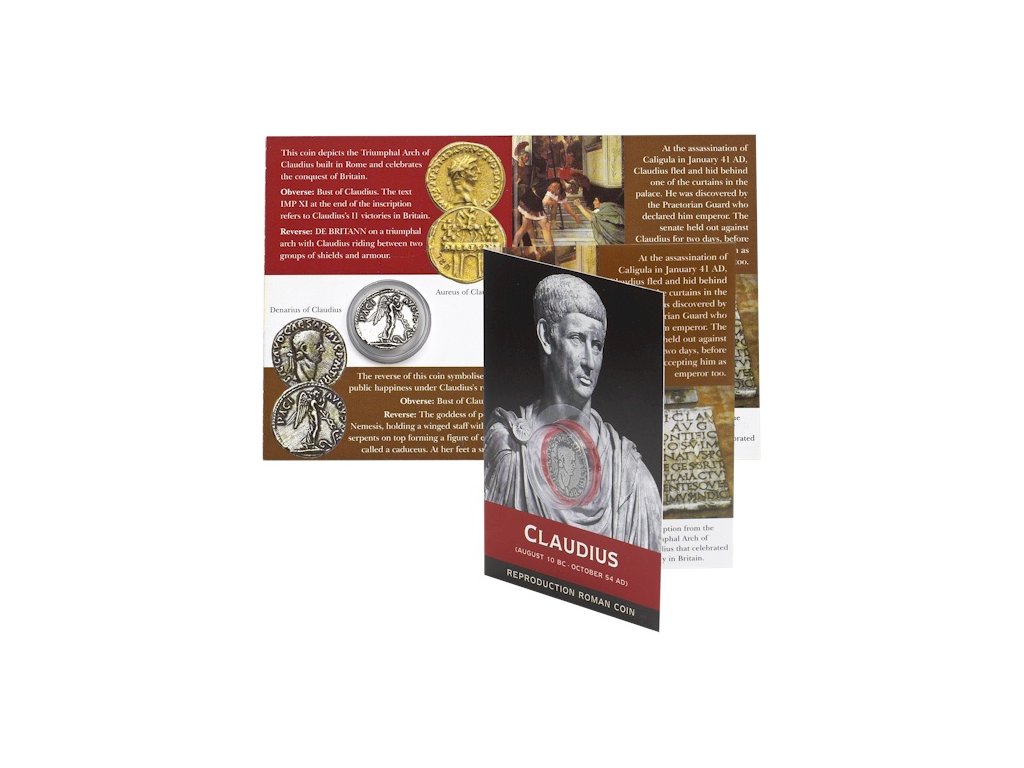 Brožúrka s reprodukciou mince Denár, ktorá je zabalená v priehľadnej kapsuľke na prednej strane. Na vnútornej a zadnej strane sú informácie o živote rímskeho cisára Klaudia.