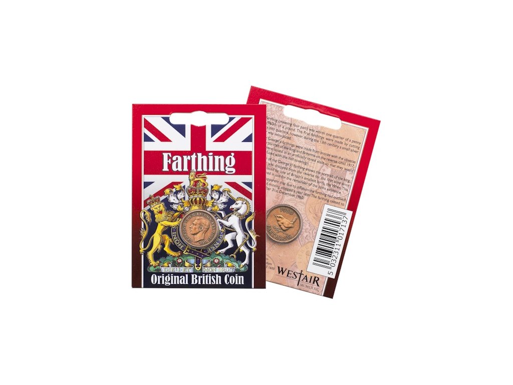 Informačná kartička s pôvodnou mincou - farthing kráľa Juraja VI., ktorá je zabalená v priehľadnej kapsuľke na prednej strane s obrázkom britskej vlajky a kráľovského erbu. Na zadnej strane je príbeh o minci farthing.