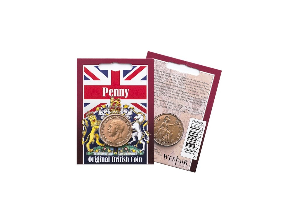 Informačná kartička s pôvodnou mincou - penny kráľa Juraja V., ktorá je zabalená v priehľadnej kapsuľke na prednej strane s obrázkom britskej vlajky a kráľovského erbu. Na zadnej strane je príbeh o minci penny.