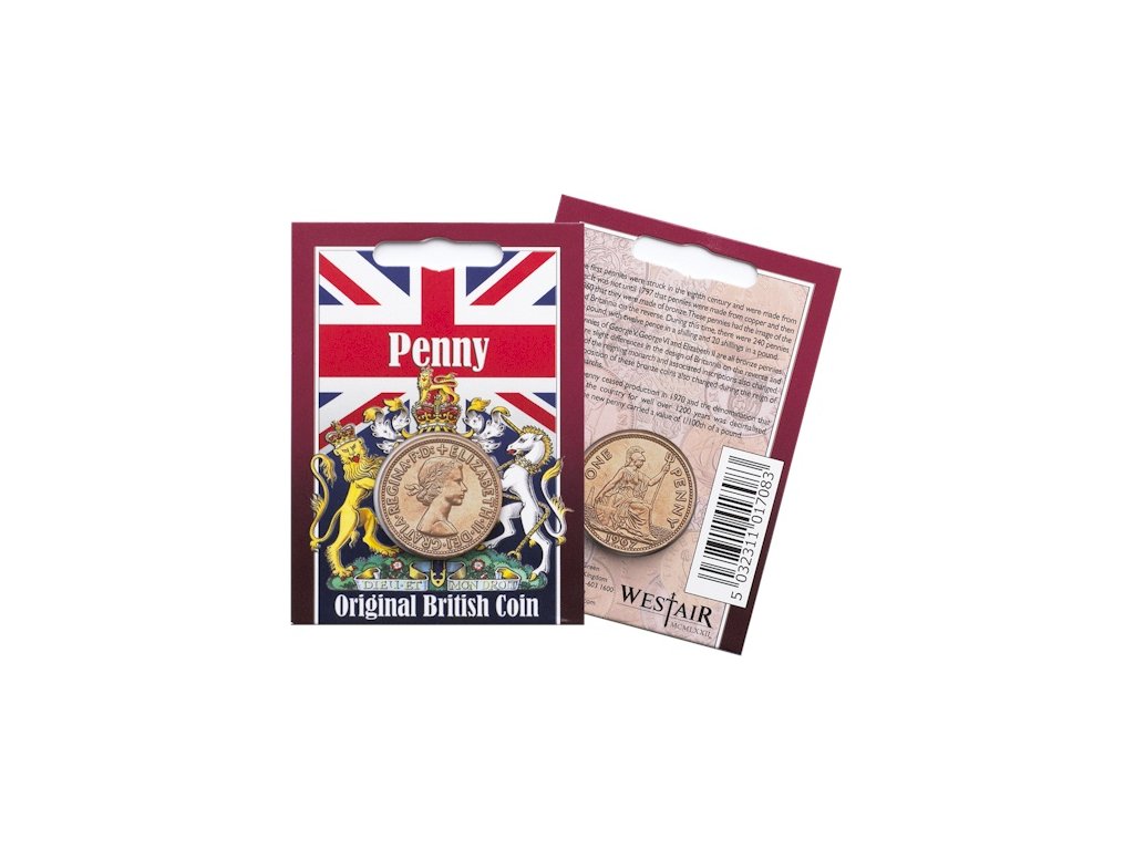 Informačná kartička s pôvodnou mincou - penny kráľovnej Alžbety II., ktorá je zabalená v priehľadnej kapsuľke na prednej strane s obrázkom britskej vlajky a kráľovského erbu. Na zadnej strane je príbeh o minci penny.