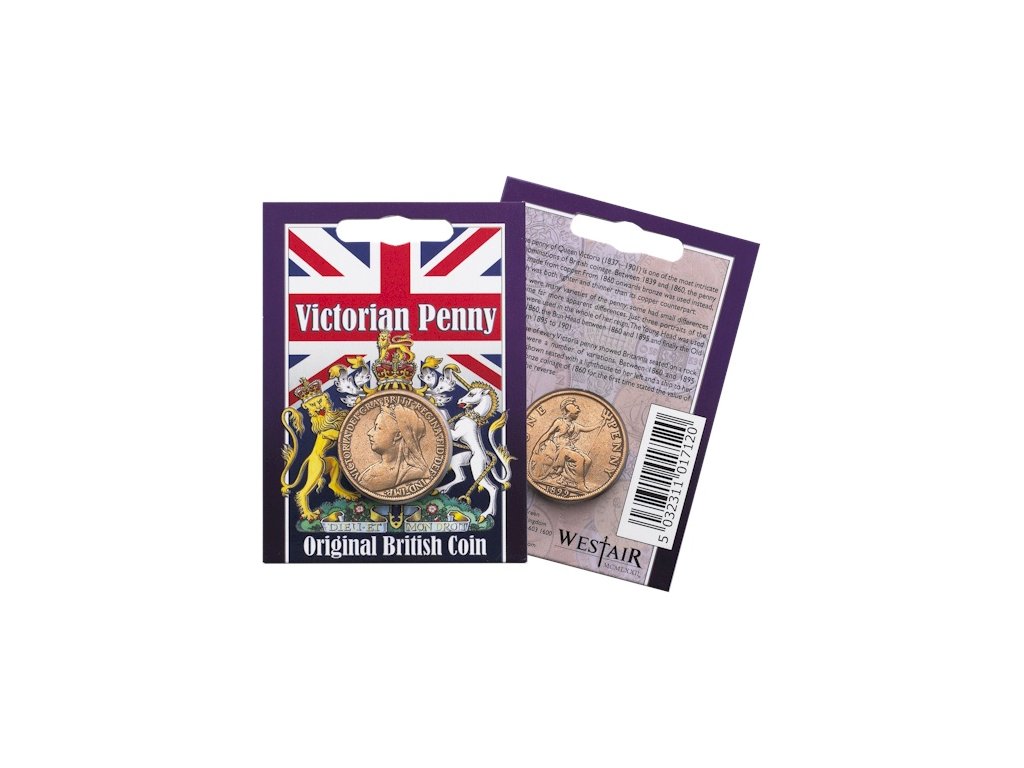 Informačná kartička s pôvodnou mincou - penny kráľovnej Viktórie, ktorá je zabalená v priehľadnej kapsuľke na prednej strane s obrázkom britskej vlajky a kráľovského erbu. Na zadnej strane je príbeh o viktoriánskej minci penny.