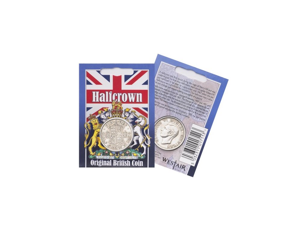 Informačná kartička s pôvodnou mincou - pol koruna kráľa Juraja VI., ktorá je zabalená v priehľadnej kapsuľke na prednej strane s obrázkom britskej vlajky a kráľovského erbu. Na zadnej strane je príbeh o pol korune.