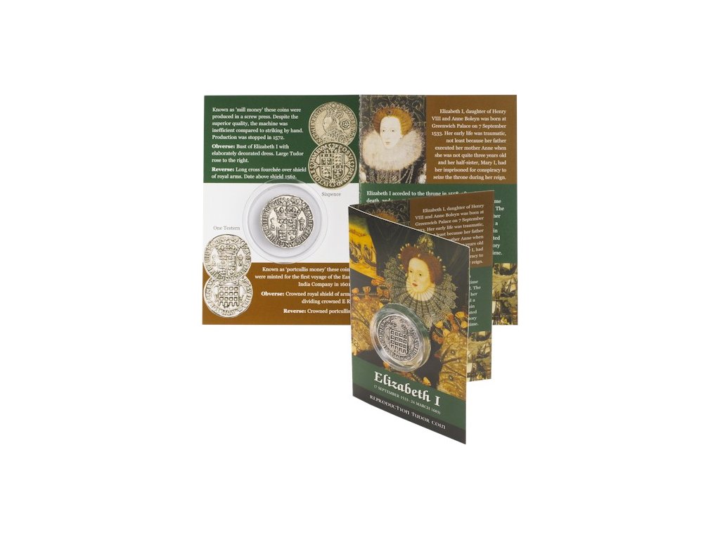 Brožúrka s reprodukciou mince- testern kráľovnej Alžbety I., ktorá je zabalená v priehľadnej kapsuľke na prednej strane. Na zadnej strane sú informácie o živote kráľovnej Alžbety I.
