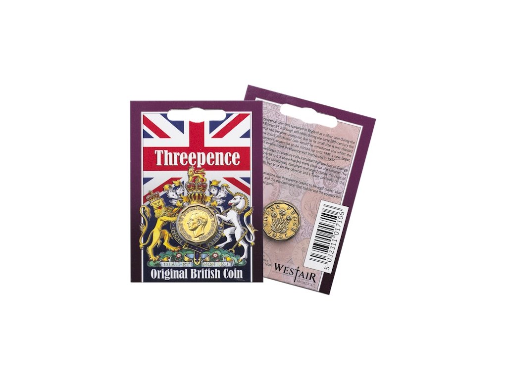 Informačná kartička s pôvodnou mincou - trojpenca kráľa JurajaVI., ktorá je zabalená v priehľadnej kapsuľke na prednej strane s obrázkom britskej vlajky a kráľovského erbu. Na zadnej strane je príbeh o trojpenci.