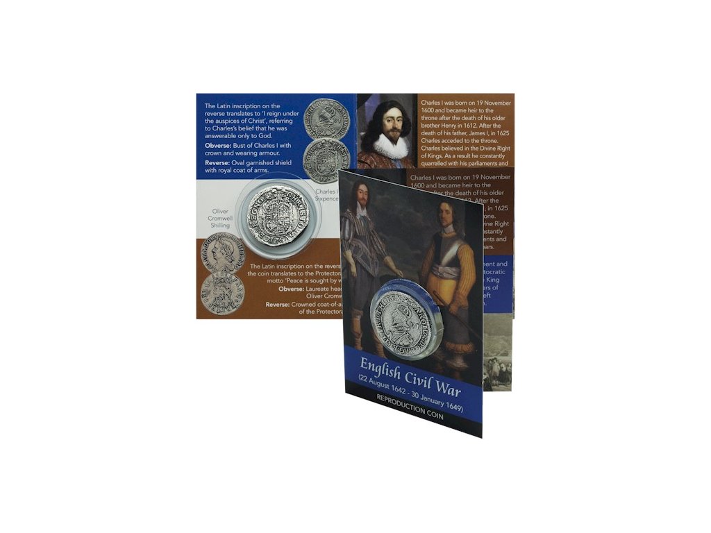 Brožúrka s reprodukciou mince šesťpenca kráľa Karola I., ktorá je zabalená v priehľadnej kapsuľke na prednej strane. Na zadnej strane sú informácie o Občianskej vojne.