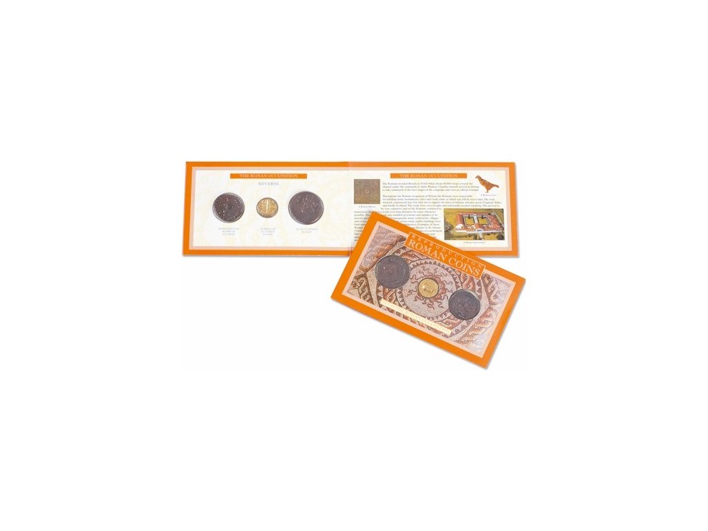 Tieto tri mince sú vyrobené z bezolovnatého cínu a zabalené do priehľadnej plastovej kapsuľky a dodávajú sa s farebnou brožúrkou s obrázkami a historickými informáciami o rímskej okupácie v Británii.