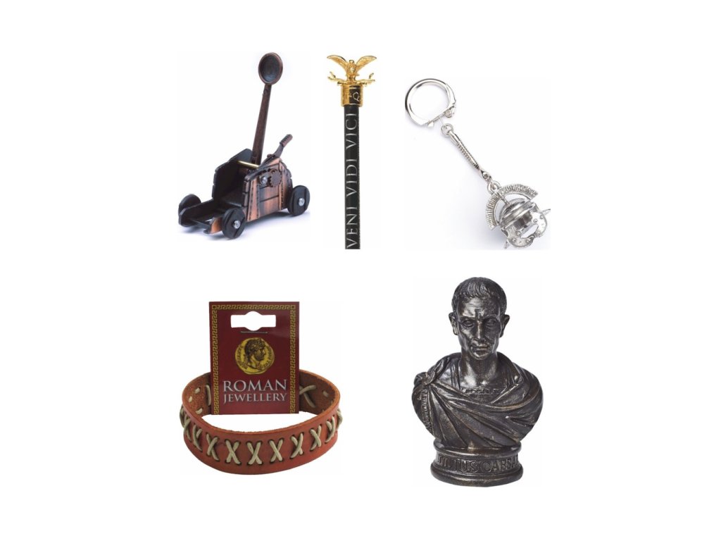 Balíček rímskych predmetov obsahuje 5 rôznych produktov z tohto obdobia: kľúčenka s motívom prilby centuriona, busta Caesara, ceruzka s pozláteným ozdobným vrškom v tvare rímskeho orla, strúhadlo na ceruzky v tvare katapultu, rímsky kožený prešívaný náramok.