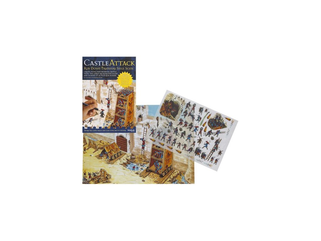 Tento balíček samolepiek - útok na hrad obsahuje A4 farebný obrázok obliehania stredovekého hradu a samostatný list s 50 samolepkami.