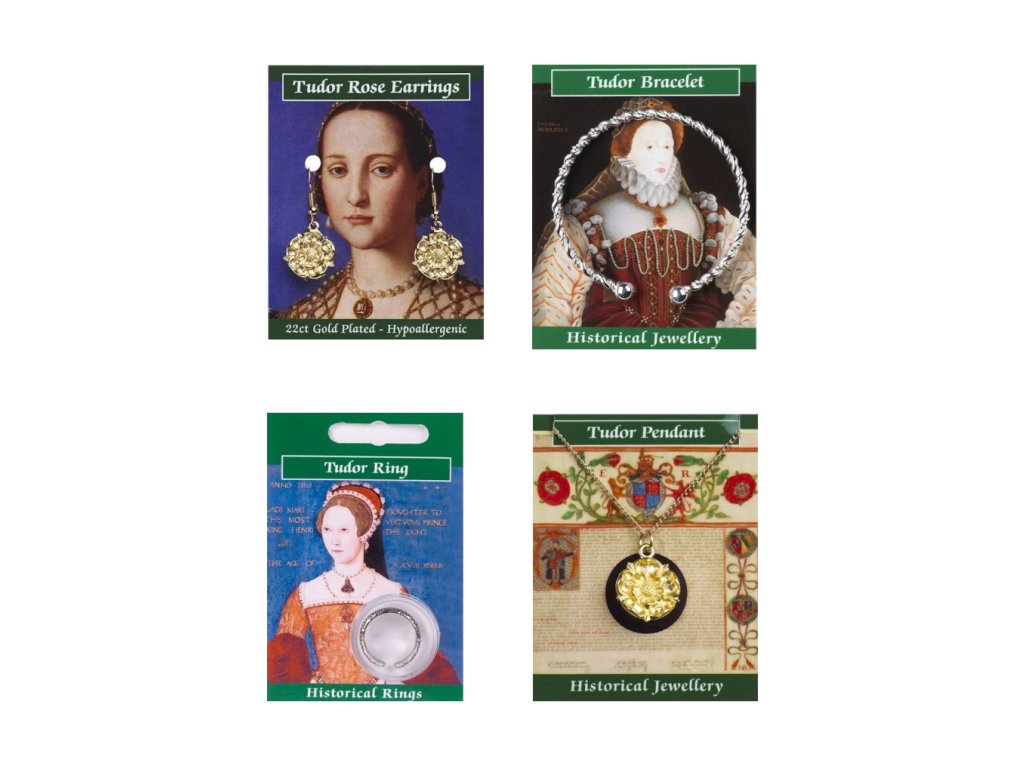 Balíček tudorovský šperkov obsahuje 4 rôzne šperky z tohto obdobia: postriebrený skrútený náramok, pozlátený prívesok tudorovskej ruže s retiazkou, pozlátené náušnice s motívom tudorovskej ruže, cínový presteň královnej Mary I.