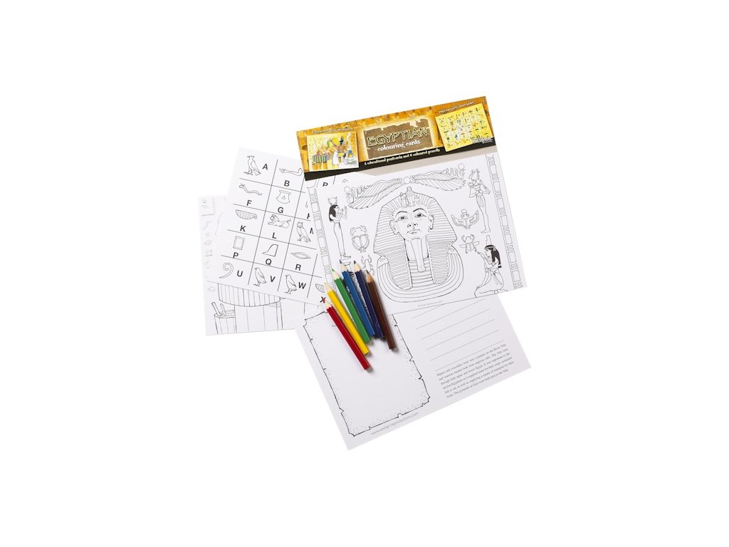 Sada 4 ks farebných pohľadníc s obrázkami zo starovekého Egypta na prednej strane a so vzdelávacími informáciami na zadnej strane sa dodáva spolu so 6 ceruzkami.