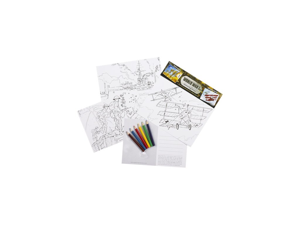 Balíček vyfarbovacích pohľadníc - I. Svetová vojna obsahuje 4 kusy A5 pohľadníc a 6 farebných ceruziek. Balíček obsahuje farebnú šablónu a celé je to zabalené do celofánového sáčku.