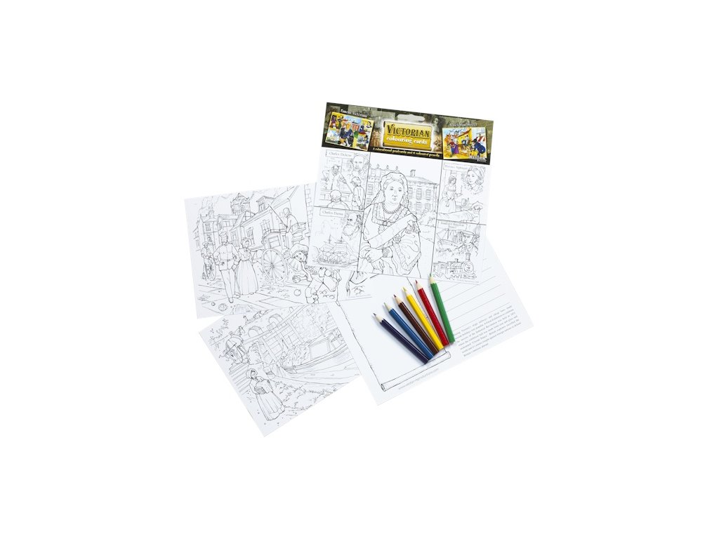 Balíček vyfarbovacích pohľadníc - viktoriánske obdobie obsahuje 4 kusy A5 pohľadníc a 6 farebných ceruziek. Balíček obsahuje farebnú šablónu a celé je to zabalené do celofánového sáčku. Na prednej strane informačnej kartičky sú obrázky známych viktoriánskych osobností, scénky viktoriánskej ulice, viktoriánskeho života a Priemyselnej revolúcie.