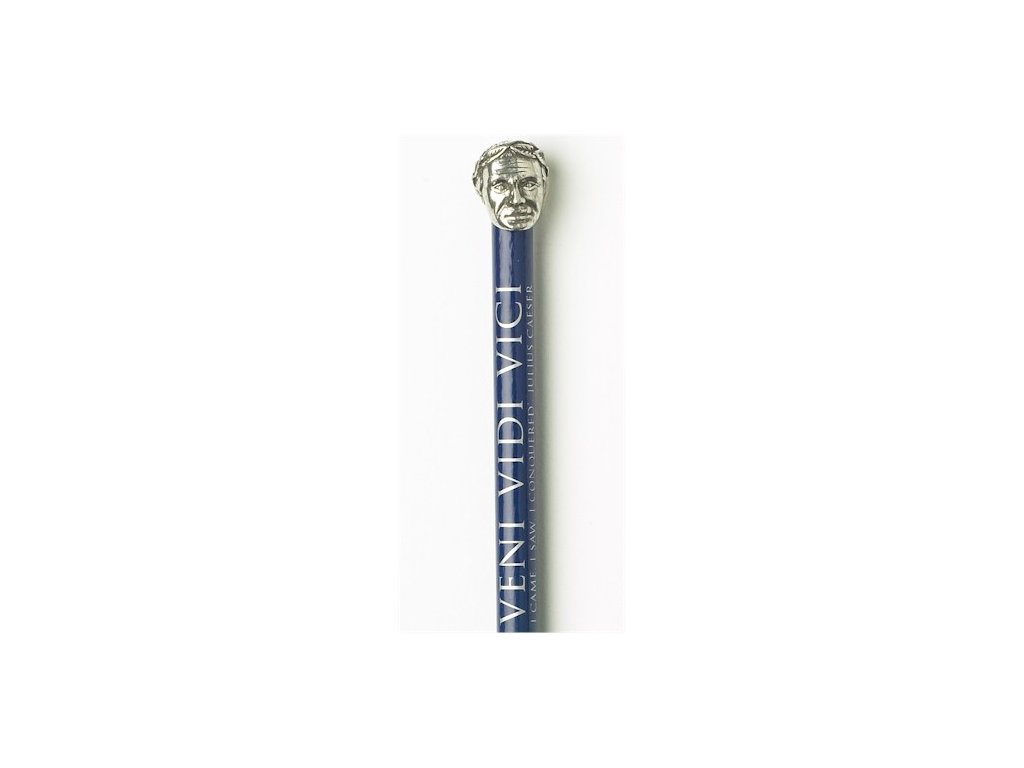 Cínový ozdobný vršok na ceruzku - hlava cisára Júlia Caesara sa dodáva s červenou alebo modrou ceruzkou s potlačou slávneho citátu Júliusa Caesara ,,Veni, Vidi, Viciˮ, čo v preklade z latinčiny znamená „Prišiel som, Videl som, Podrobil som“.