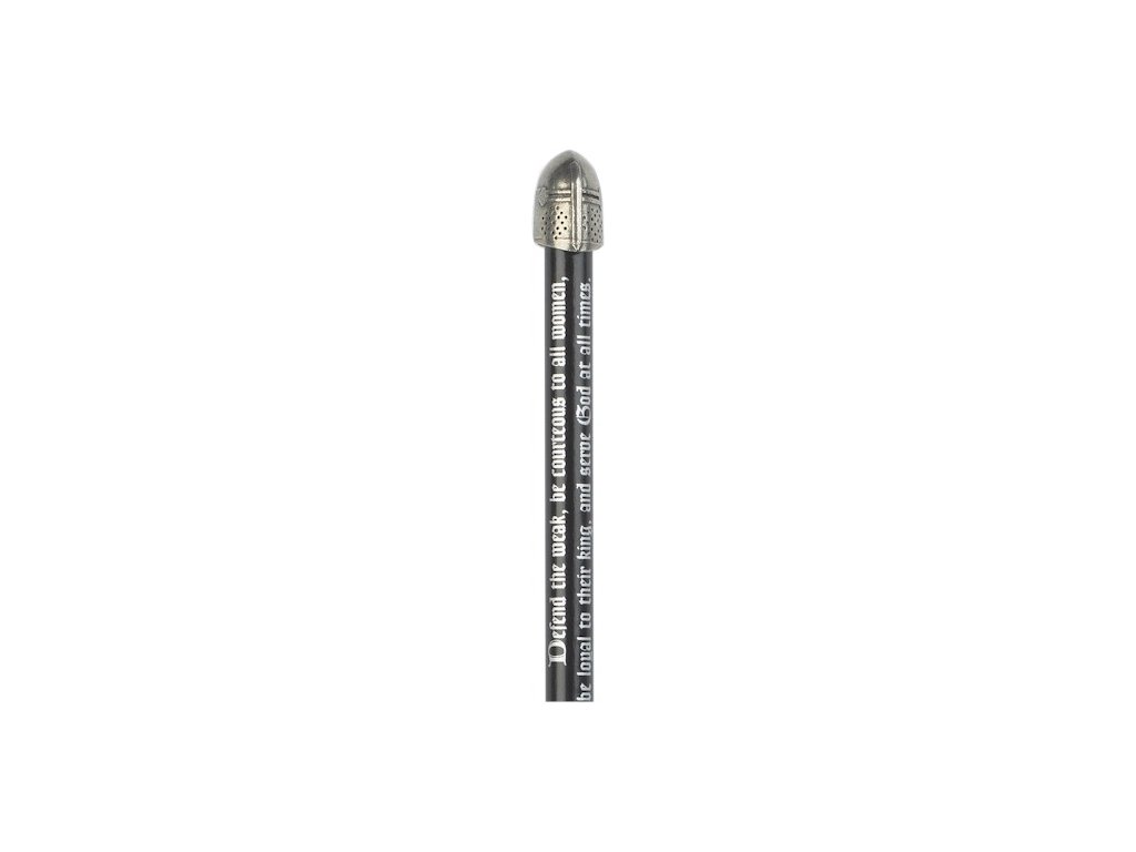 Cínový ozdobný vršok na ceruzku - prilba rytiera sa dodáva s čiernou ceruzkou s potlačou motta rytierstva „Bráň slabých, Buď zdvorilý ku všetkým ženám, Buď lojálny ku kráľovi a Slúž Bohu naveky“.