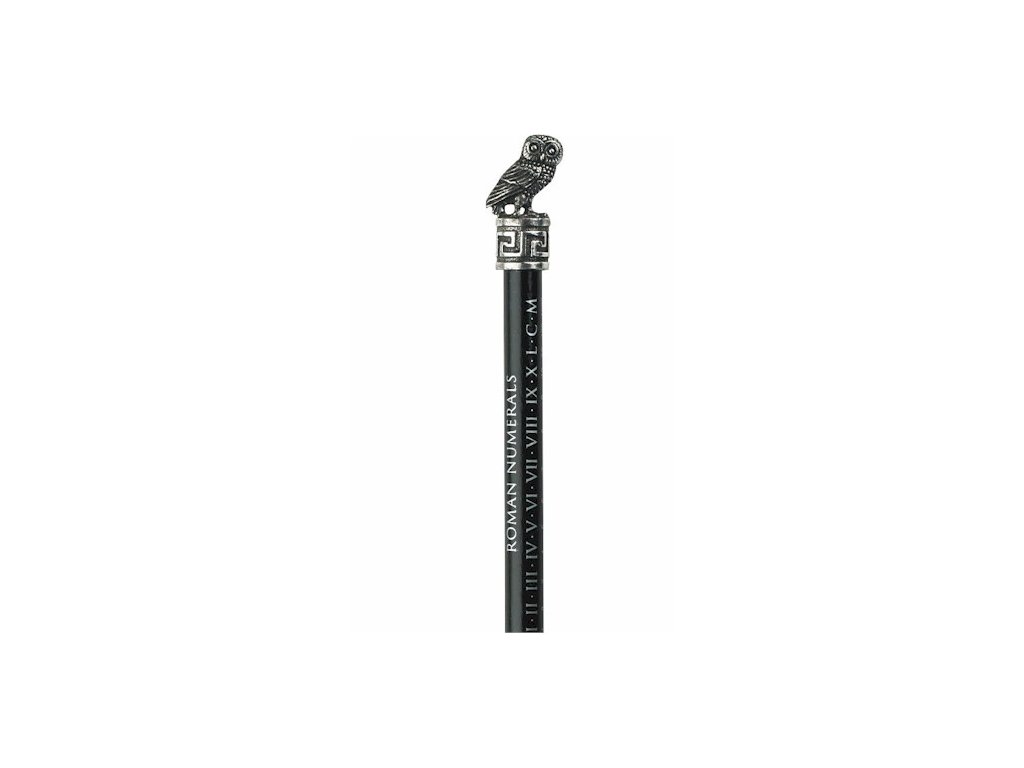 Cínový ozdobný vršok na ceruzku - rímska sova Minerva sa dodáva s čiernou ceruzkou s potlačou rímskych číslic.