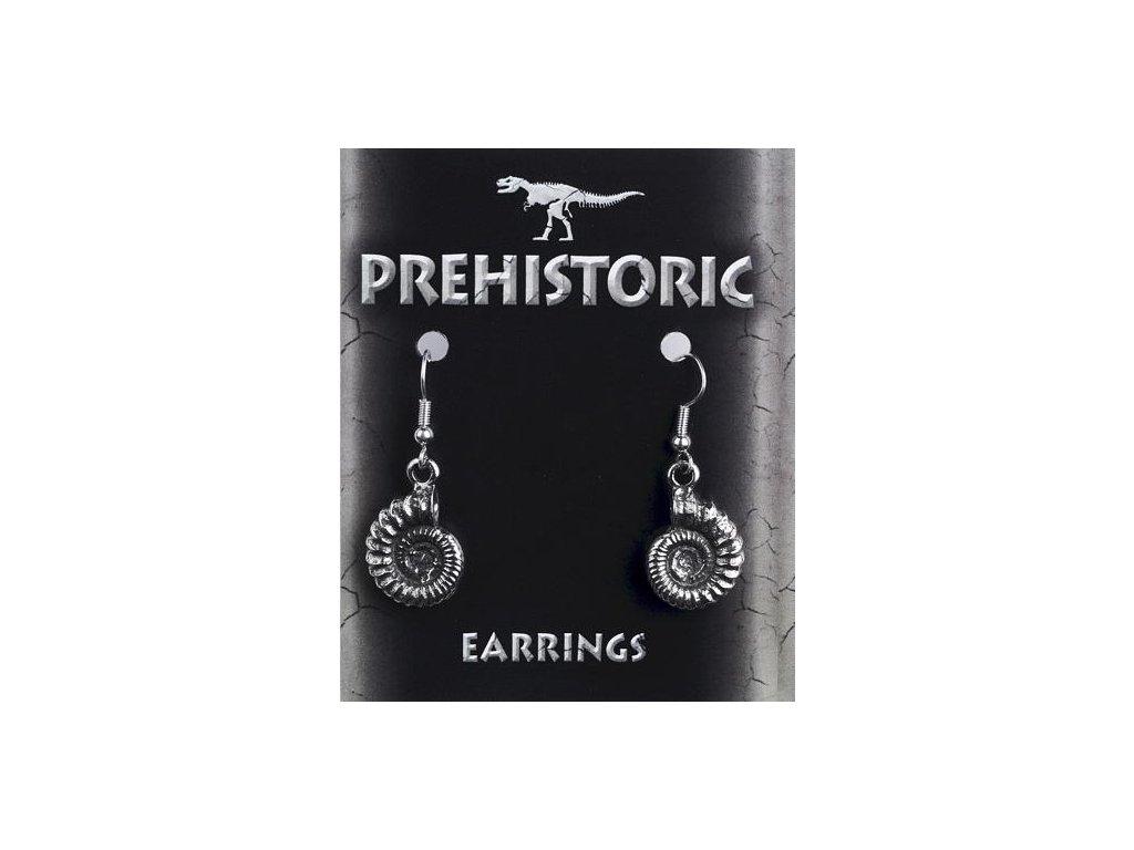 Cínové náušnice- amonita sa dodávajú spolu s hypoalergickými náušnicovými háčikmi. Na zadnej strane informačnej kartičky sú podrobnosti o dinosauroch.