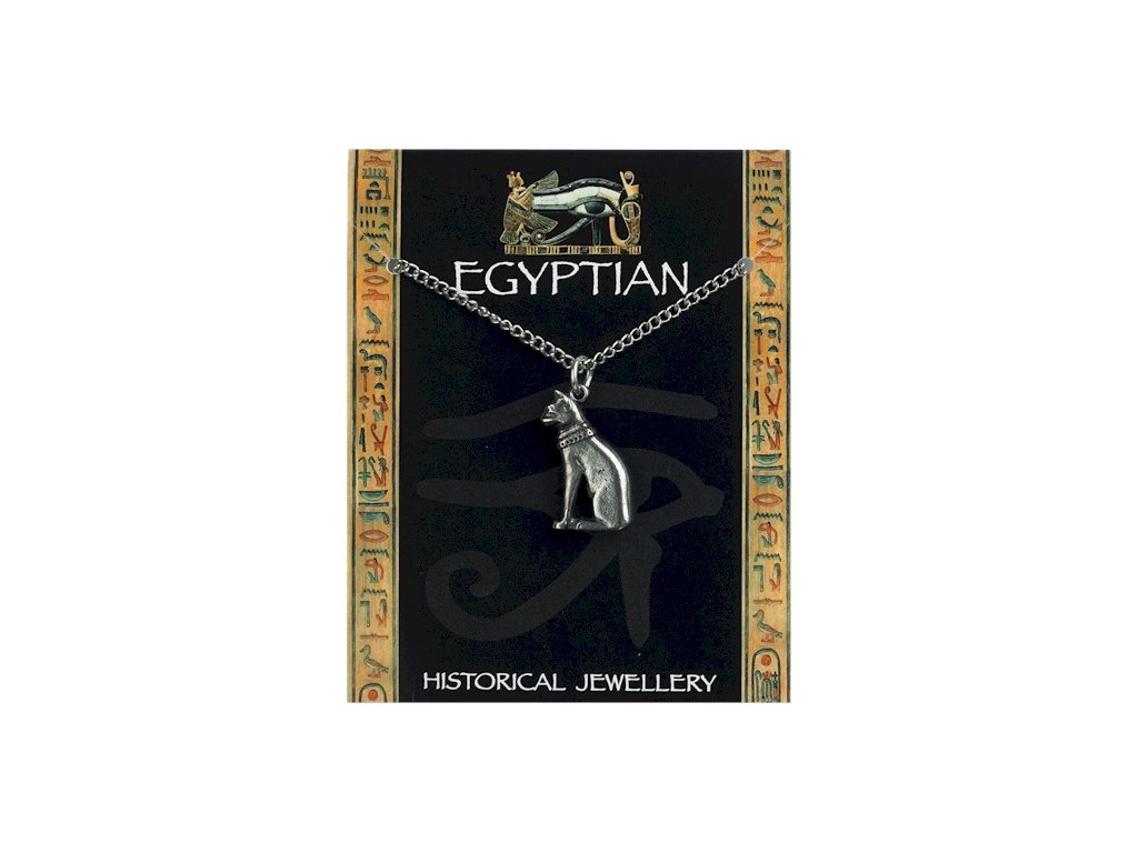 Cínový prívesok - mačka sa dodáva s postriebrenou retiazkou. Na informačnej kartičke je popis dôvodov, prečo starovekí Egypťania nosili šperky.