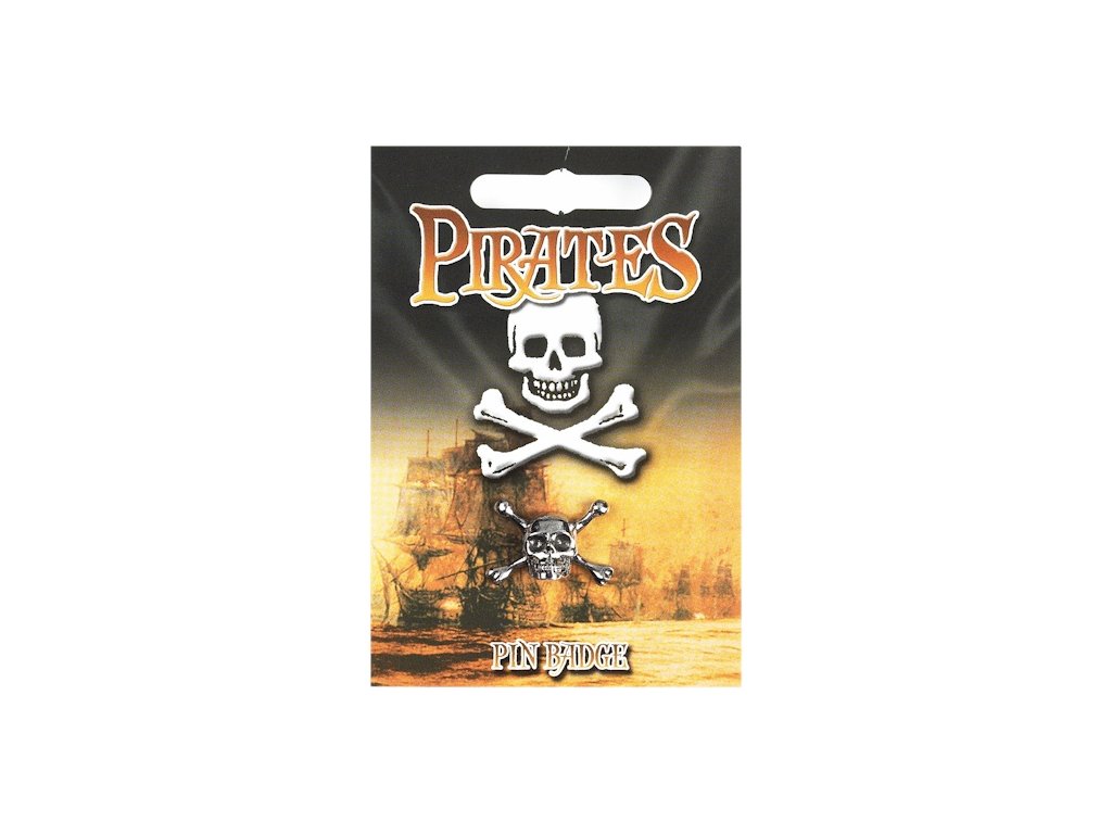 Cínový odznak - lebka s prekríženými hnátmi sa dodáva so zapínacou sponou. Na zadnej strane informačnej kartičky je popis, kto boli piráti a informácie o pirátskych vlajkách.
