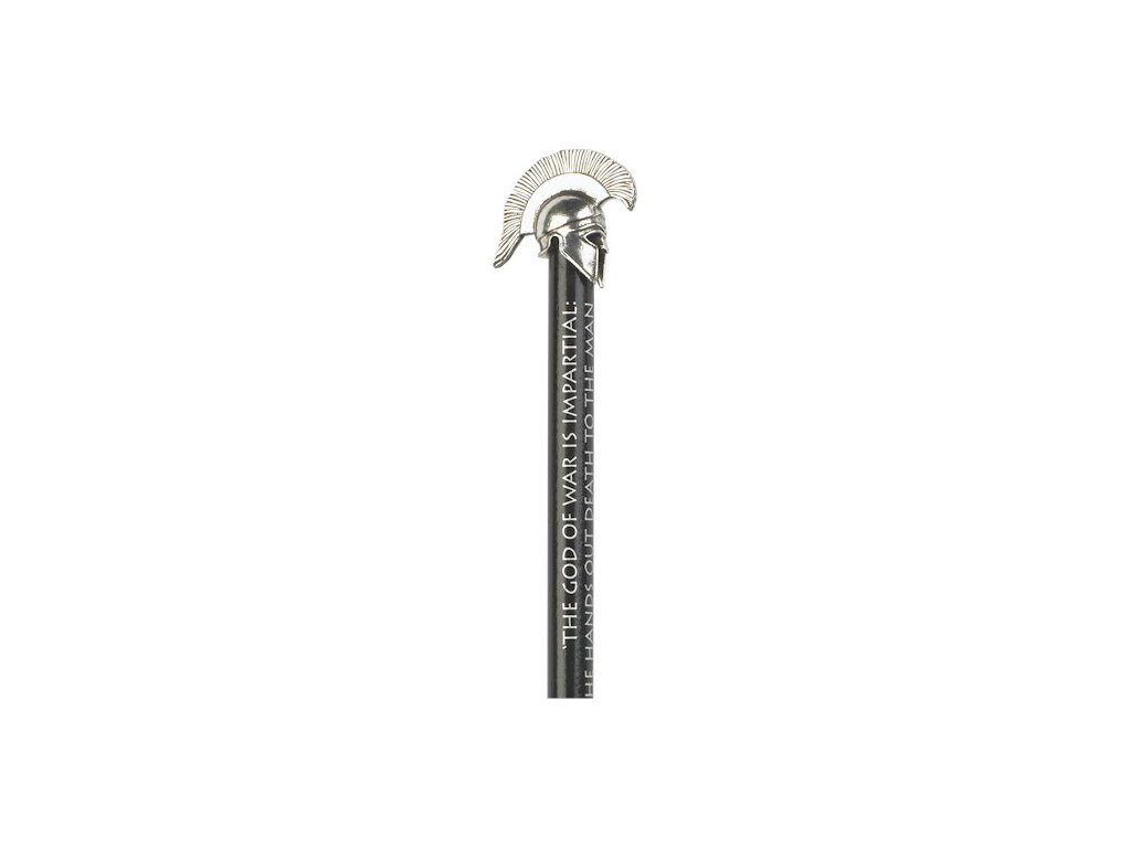Cínový ozdobný vršok na ceruzku - starogrécka prilba sa dodáva s čiernou ceruzkou s potlačou: „Boh vojny je nestranný: Rozdáva smrť mužom, ktorí rozdávajú smrť”.