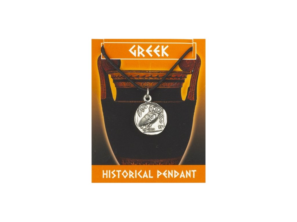 Cínový prívesok - kópia gréckej mince so sovou sa dodáva s povoskovanou šnúrkou. Na informačnej kartičke je vysvetlenie ako sa grécka mytológia premieta do dizajnu gréckych šperkov a mincí.