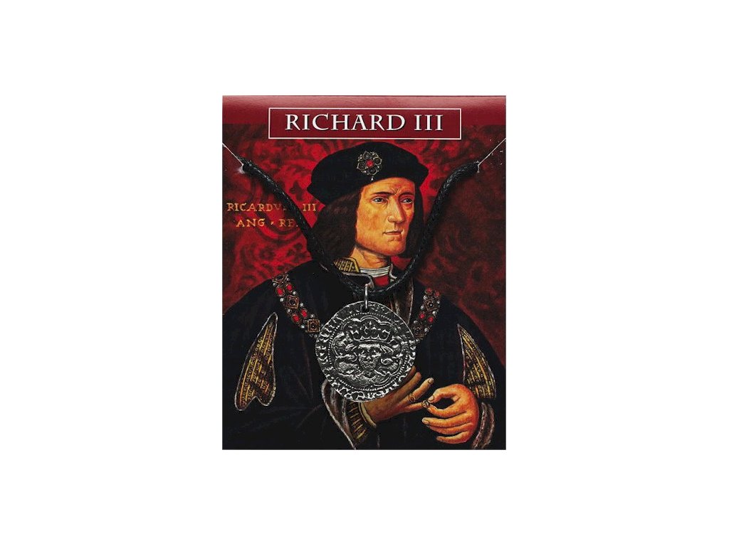 Cínový prívesok - minca kráľa Richarda III. sa dodáva na povoskovanej šnúrke. Na zadnej strane informačnej kartičky sú historické informácie o vláde Richarda III., jeho embléme kanca a vyrazených minciach.