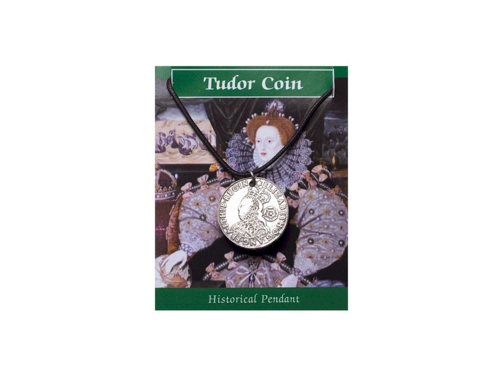 Cínový prívesok mince - šesťpenca kráľovnej Alžbety I. sa dodáva s povoskovanou šnúrkou. Na zadnej strane informačnej kartičky je popis mincí z obdobia vlády Tudorovcov.