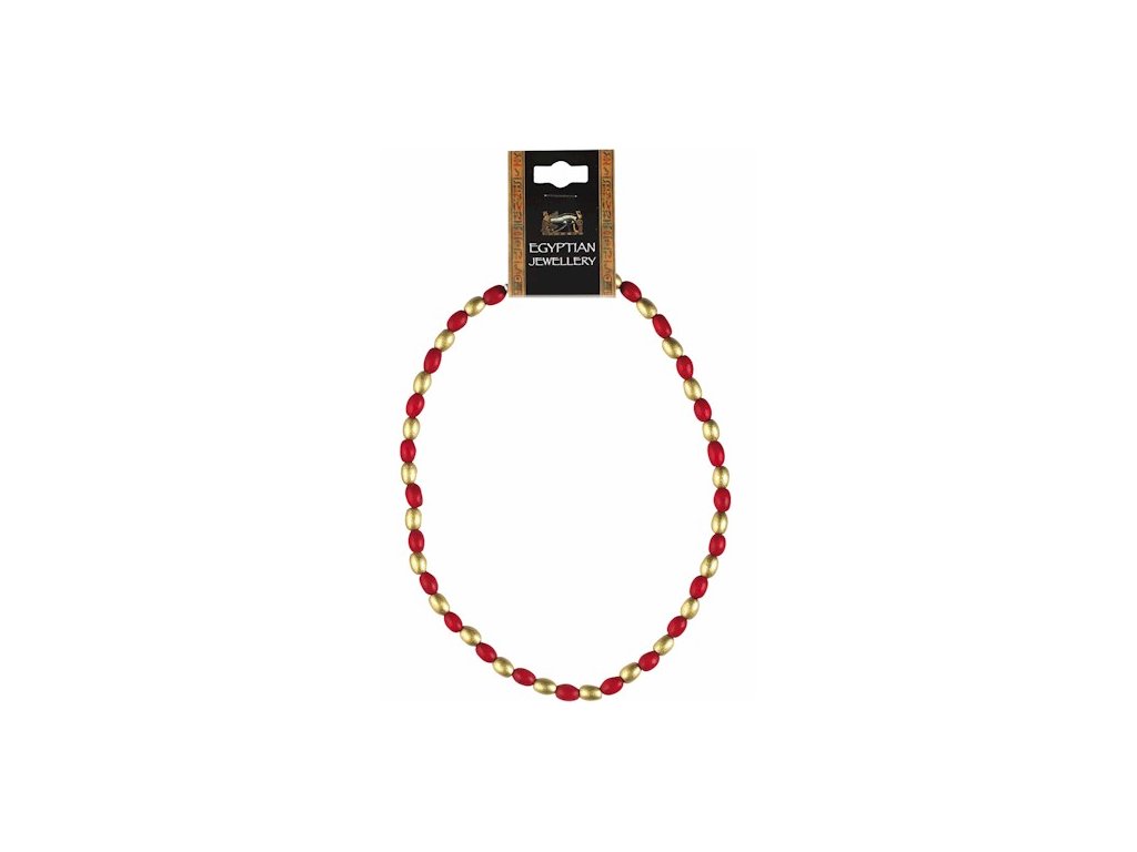 Náhrdelník inšpirovaný starovekými egyptskými šperkami. Náhrdelník je zložený z drevených korálikov červenej a zlatej farby a dodáva sa s informačnou kartičkou.