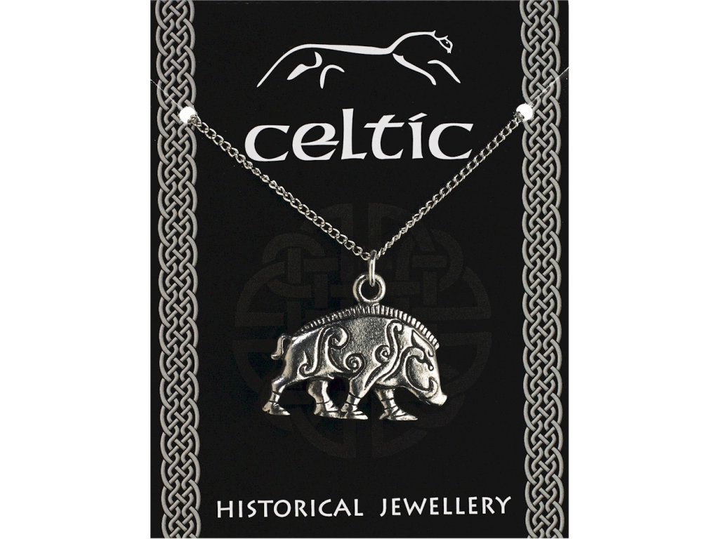 Keltský cínový prívesok s retiazkou - keltský kanec sa dodáva s postriebrenou retiazkou. Na zadnej strane informačnej kartičky je popis keltského umenia a význam symbolu keltského kanca pre Keltov.