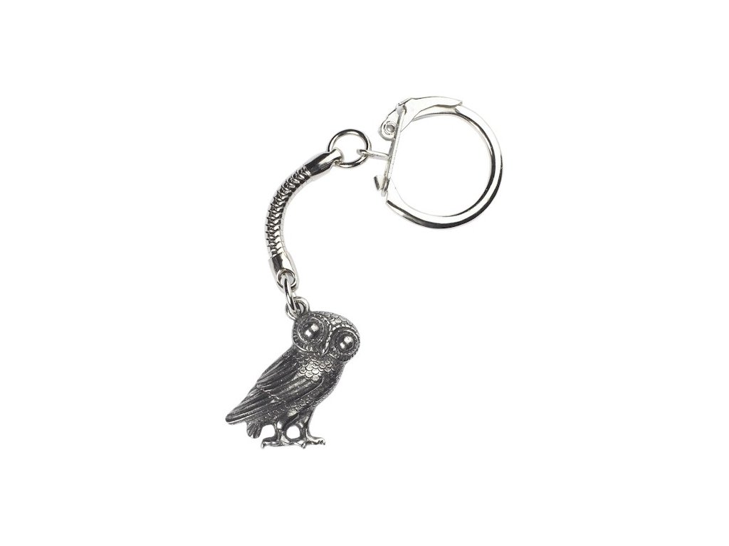 Cínová kľúčenka grécka sova, symbol bohyne Atény sa dodáva s kvalitným krúžkom na kľúče.