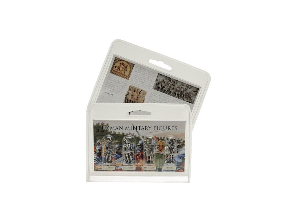 Štyri cínové figúrky Rimanov sa dodávajú v krabičke s farebnými obrázkami Kolosea a Rimanov v boji na prednej strane informačnej kartičky a s informáciami o prítomnosti Rimanov v Británii.