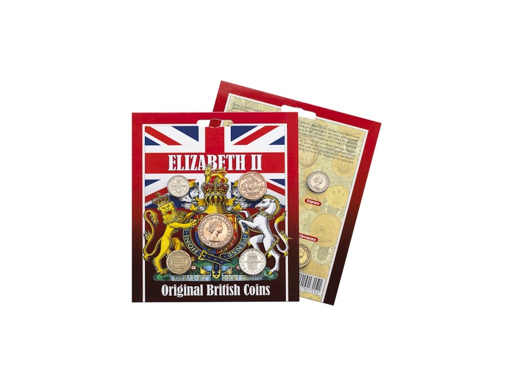 Kolekcia 5 pôvodných mincí kráľovnej Alžbety II , ktoré sú zabalené v priehľadnej kapsuľke na prednej strane informačnej brožúrky. Na prednej strane informačnej kartičky je obrázok britskej vlajky a kráľovského erbu. Na zadnej strane sú informácie o kráľovnej Alžbete II. a minciach.
