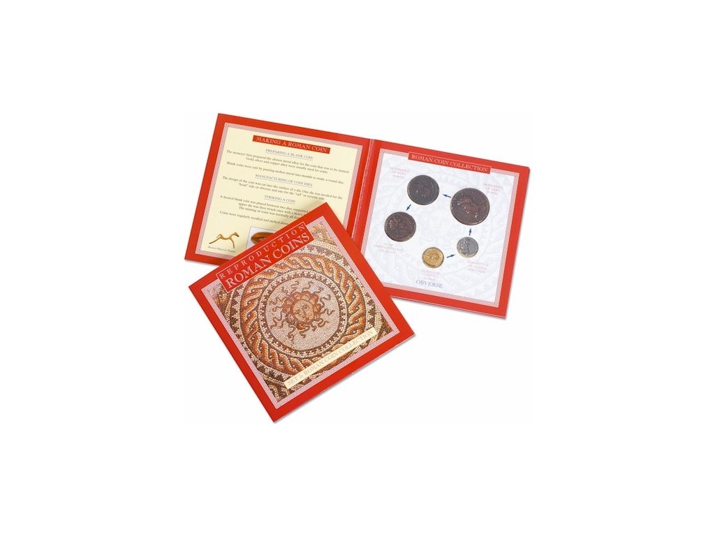 Kolekcia 5 reprodukcií rímskych mincí , ktoré sú zabalené v priehľadnej kapsuľke v strede informačnej brožúrky. Vo vnútri a na zadnej strane informačnej brožúrky je popis ako sa mince vyrábali, ako sa používali na šírenie správ a čo sa dalo kúpiť s rímskymi peniazmi.