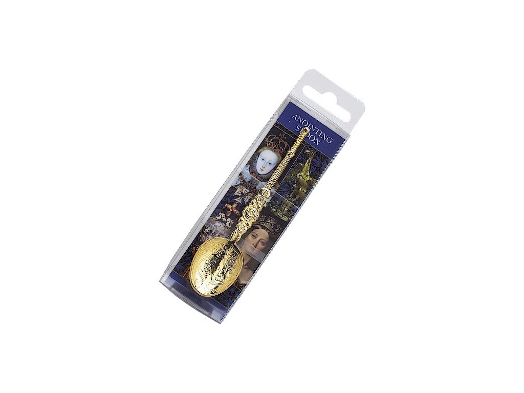 Cínová kópia lyžičky na pomazanie, ktorá je súčasťou korunovačných klenotov. Lyžička je zabalená v priehľadnej škatuľke s informačnou kartičkou s popisom lyžičky a ako ju používali.