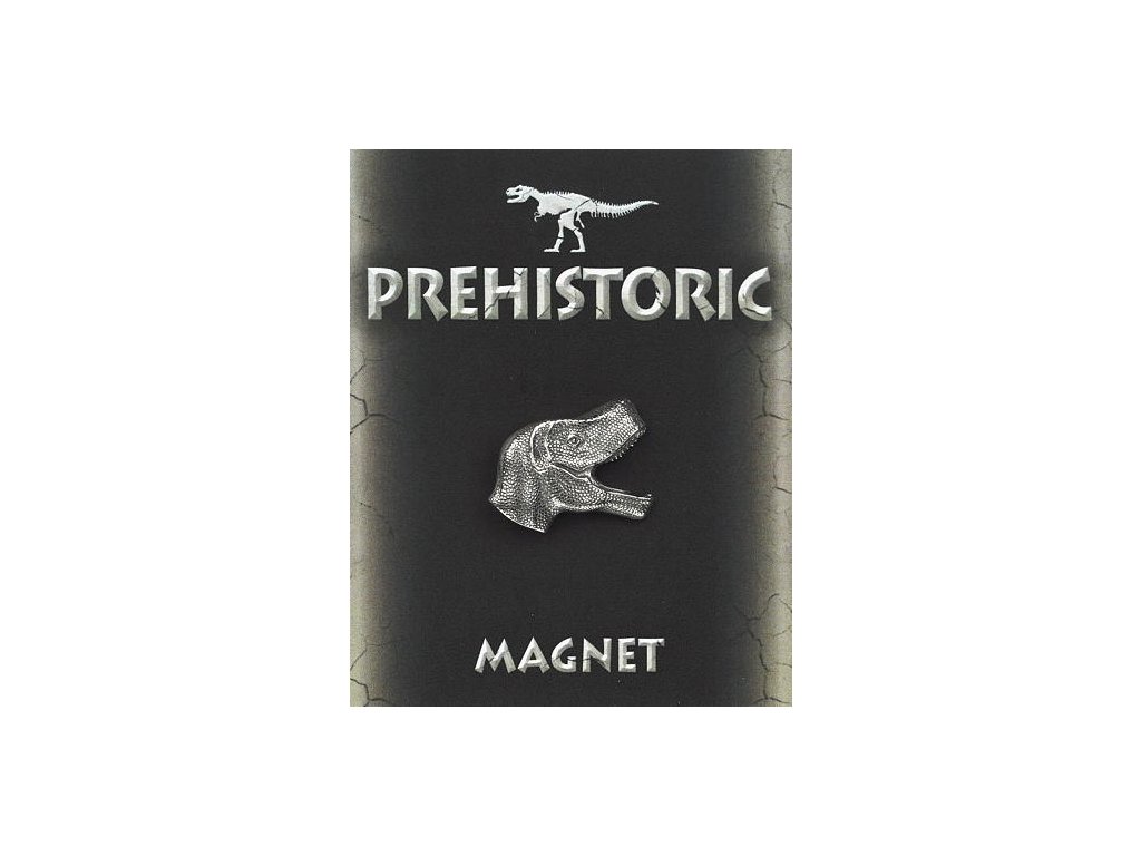 Magnet - cínová hlava T-Rexa, na zadnej strane informačnej kartičky sú podrobnosti o dinosauroch.