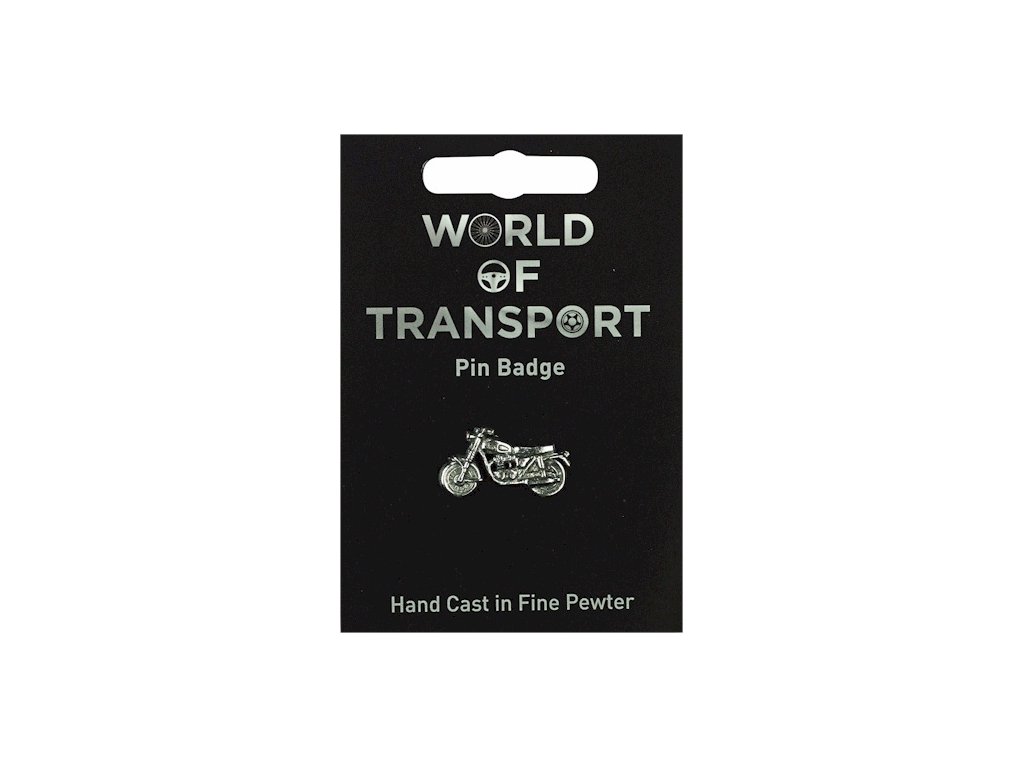 Tento odznak – klasický motocykel je vyrobený z bezolovnatého cínu a je dodávaný so zapínacou sponou. Informačná karta opisuje vývoj prepravy od oslov až po autá.