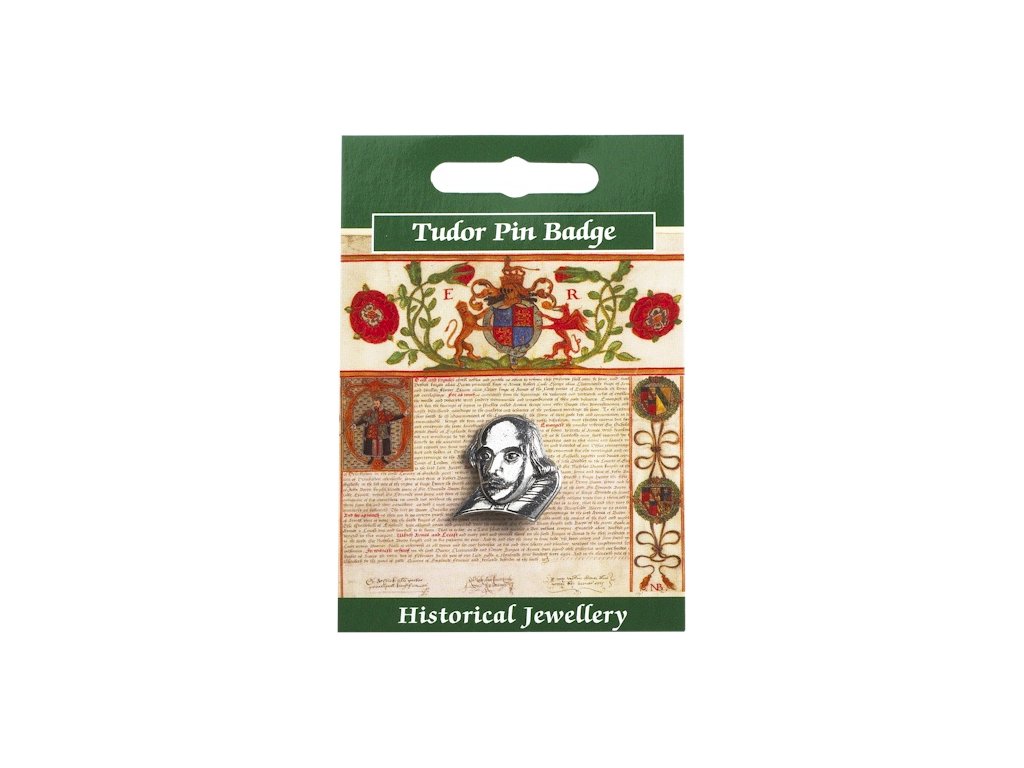 Cínový odznak - busta Williama Shakespeara sa dodáva so zapínacou sponou. Na prednej strane informačnej kartičky je obrázok papierového zvitku a na zadnej strane informačnej kartičky je krátky príbeh o Tudorovcoch.