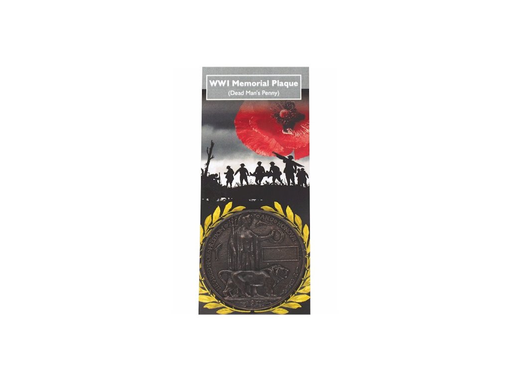 Informačná kartička s pamätnou plaketou z I. Svetovej vojny. Na informačnej kartičke je popis ako sa plaketa udeľovala vojakom, ktorí zahynuli v I. Svetovej vojne.