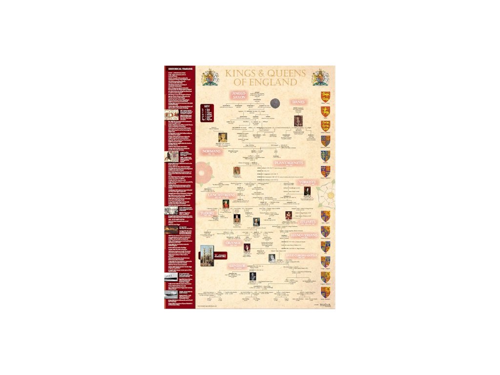 A3 plagát s obrázkom rodinného stromu Kráľov a Kráľovien - od kráľa Egberta až po kráľovnú Alžbetu II. Na plagáte je aj časová os zobrazujúca významné historické udalosti.