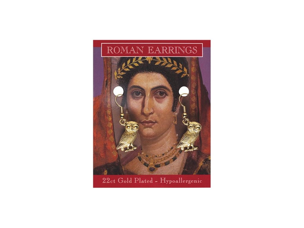 Pár pozlátených cínových náušníc sova sa dodáva spolu s hypoalergickými náušnicovými háčikmi so zapínaním. Na zadnej strane informačnej kartičky je vysvetlenie, prečo sova bola mocným symbolom a tiež obrázok ďalších dostupných rímskych náušníc.