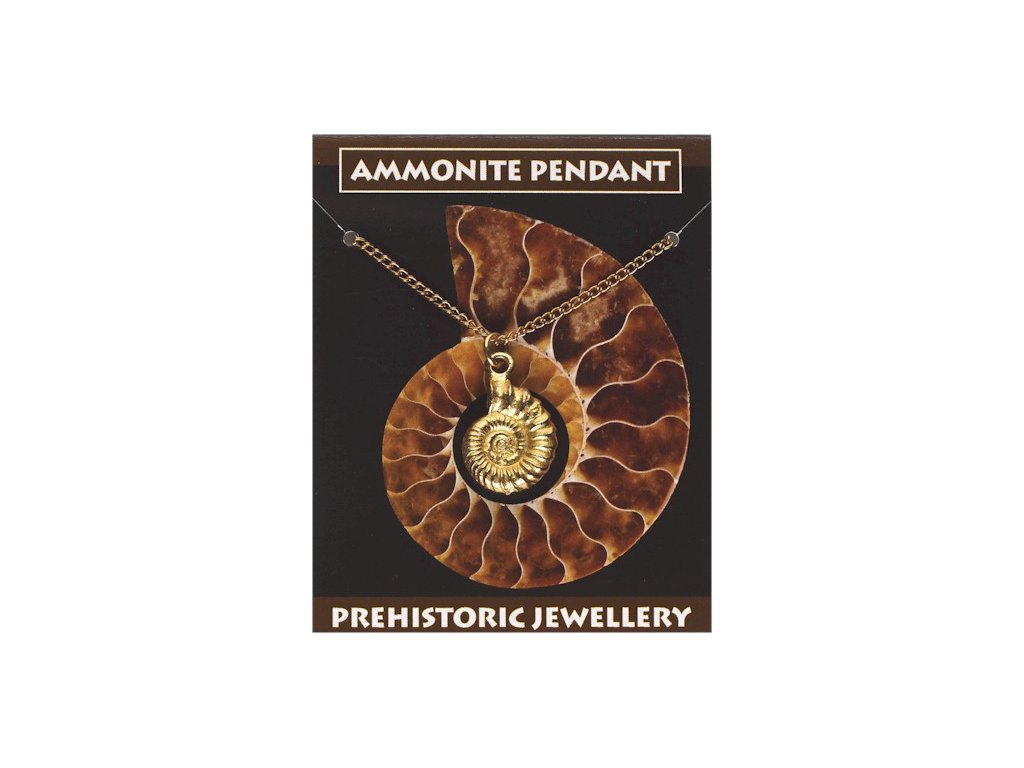 Pozlátený Amonitový prívesok, dodávaný s pozlátenou retiazkou. Na zadnej strane kartičky sú informácie o Amonitoch a o tom ako sa z nich stali fosílie.