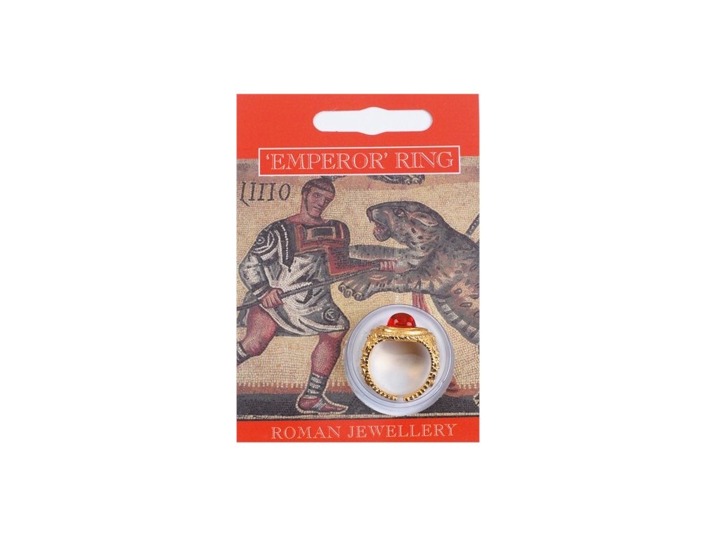 Pozlátený cínový cisársky prsteň s kameňom je zabalený do priehľadnej kapsuľky a dodáva sa spolu s informačnou kartičkou s popisom šperkov za čias Rímskej ríše a gladiátorských hier, ktoré sa odohrávali v amfiteátri.
